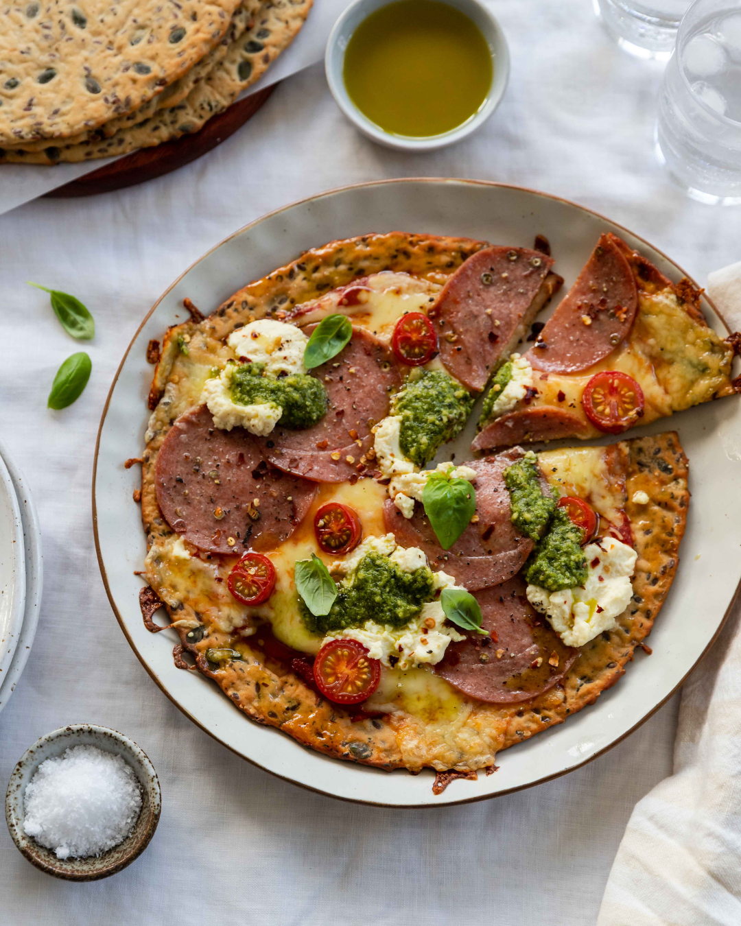 Low Carb High Protein Salami & Pesto Pizza