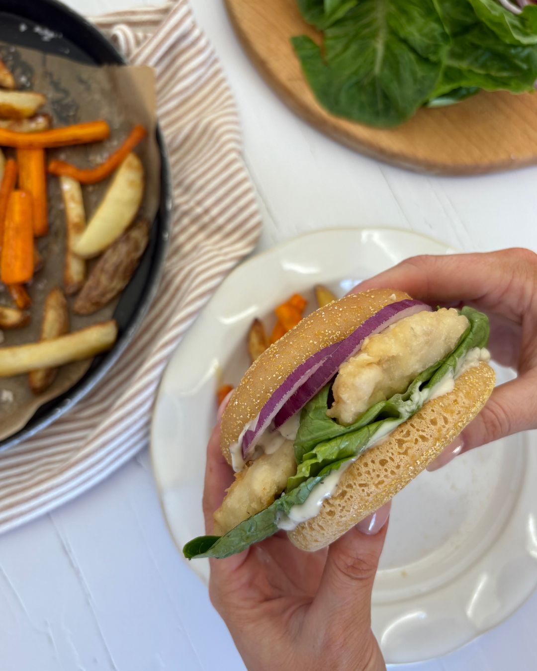 Golden, ultra-crispy snapper fillets tucked into our Sweet Potato Sourdough Buns and slathered with tangy, creamy picklenaise, this burger delivers the perfect balance of crunch, zest, and freshness. Paired with hot, perfectly seasoned oven fries, it’s a coastal-style comfort meal that feels gourmet without the fuss.