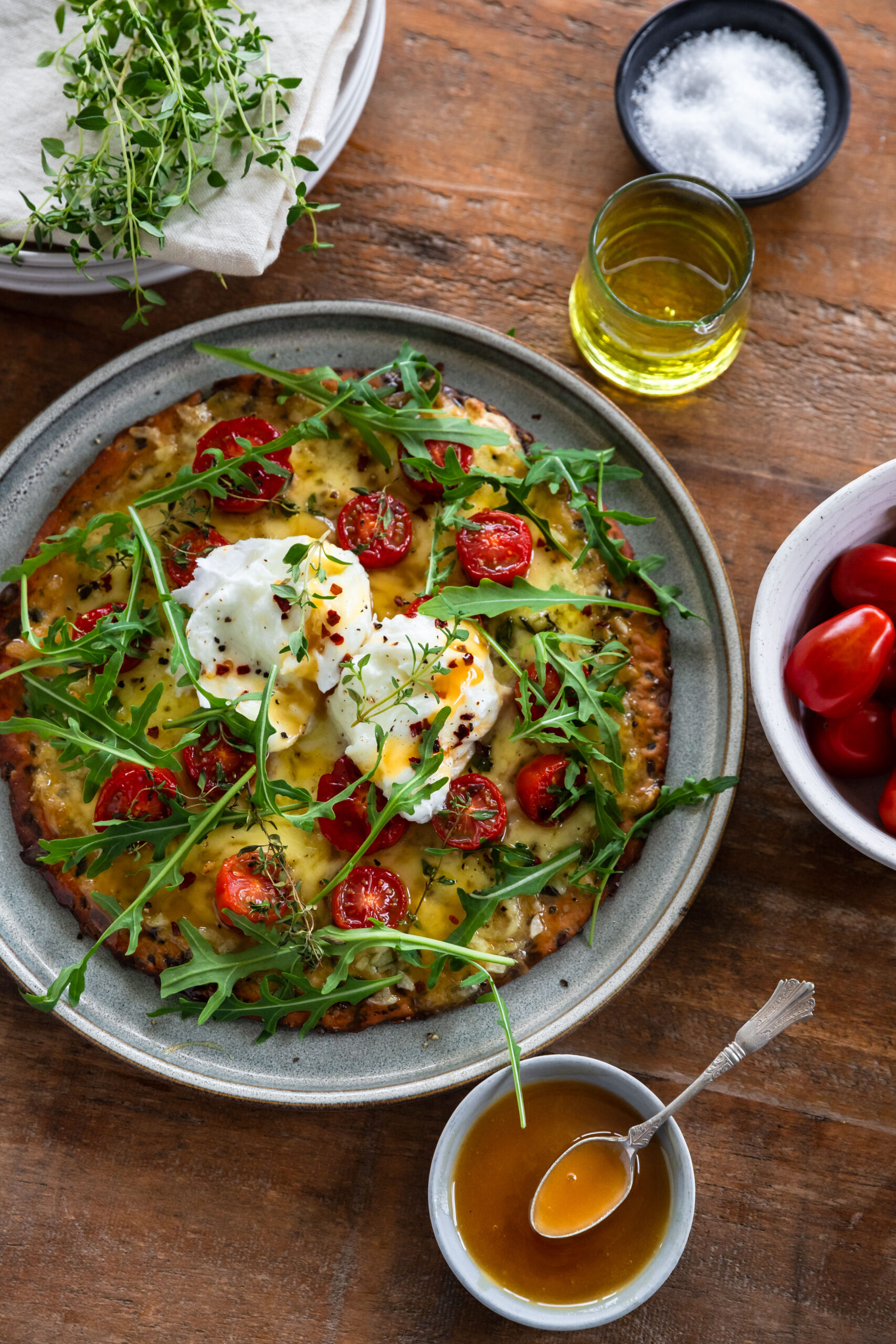Taylor Pass honey, mozzarella, cherry tomato and thyme high-protein pizza